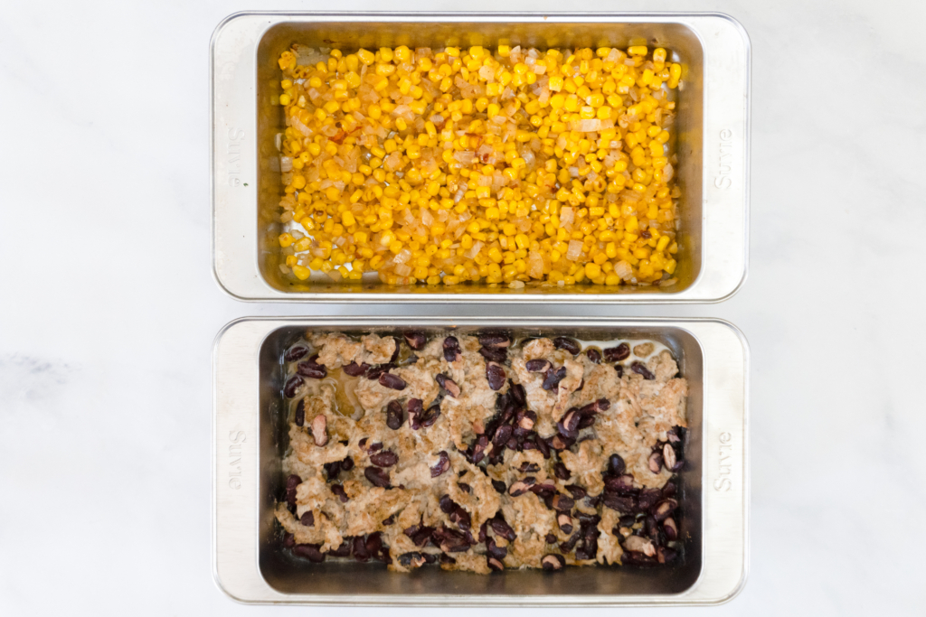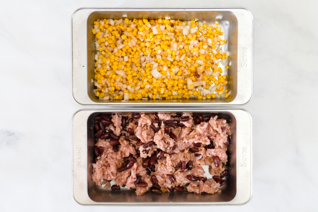 1) Grease two Suvie pans. Crumble 1 lb ground turkey into one pan and season with 2 tsp olive oil, 1 tsp kosher salt, ½ tsp ground black pepper, and 2 tsp cumin. Gently stir in kidney beans to combine and transfer pan to the bottom zone of Suvie.