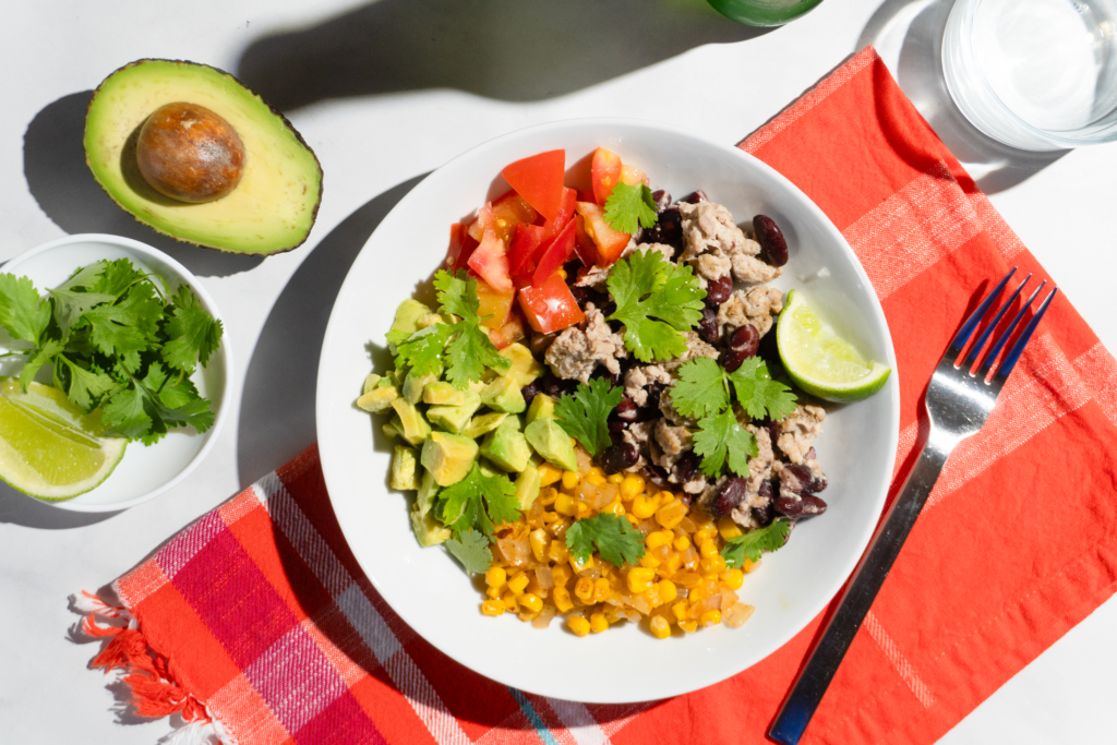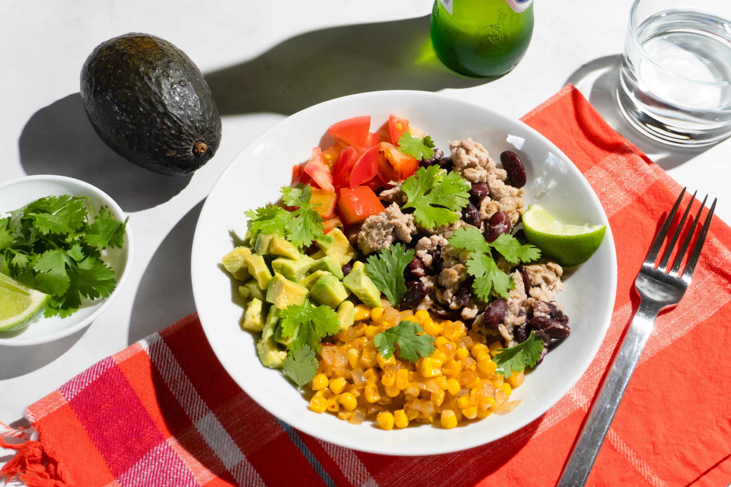 This high protein, vegetable-forward dish delivers all the taco flavors you love in one nutritious package. Instead of rice, roasted corn and onions serve as the base for the taco bowl which is topped with cumin roasted ground turkey, red kidney beans, and a medley of toppings.