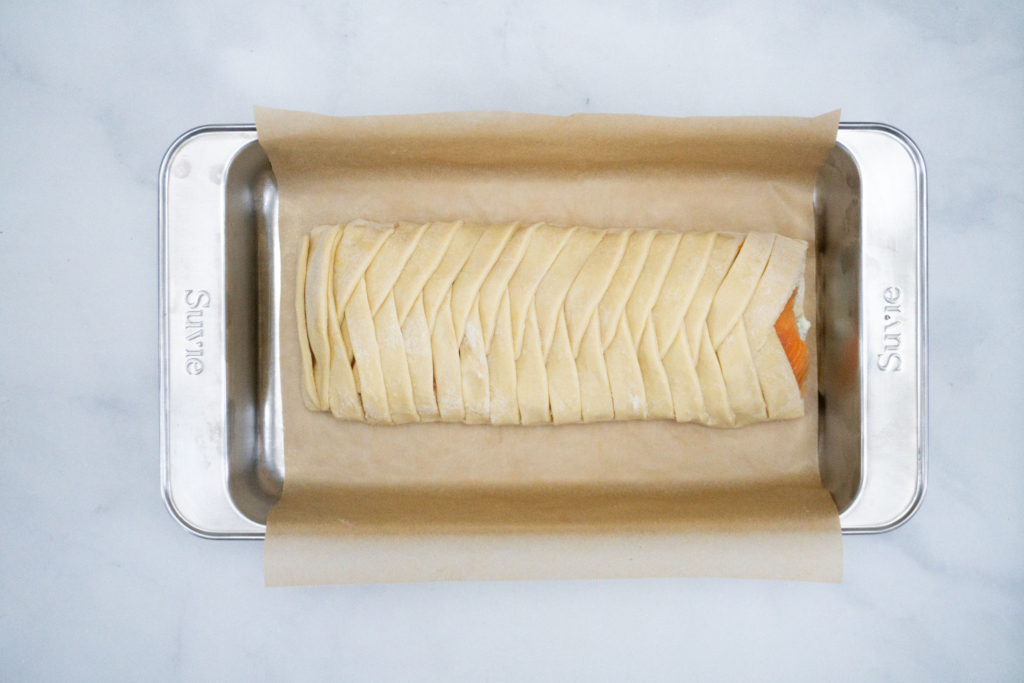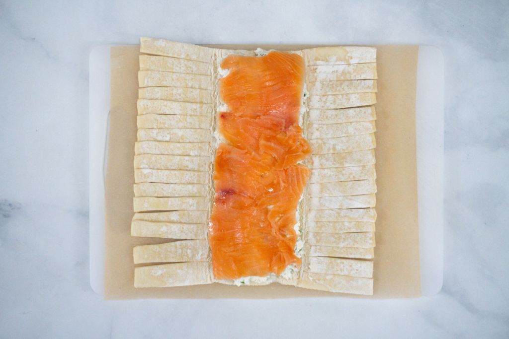 2) Cut a piece of parchment into a 9 ½ x12″ rectangle. Lay defrosted puff pastry onto parchment. Spread cream cheese mixture lengthwise down the middle of the dough in a 3-inch wide band. Cut salmon into 2″ wide strips and arrange on top of the cream cheese mixture.