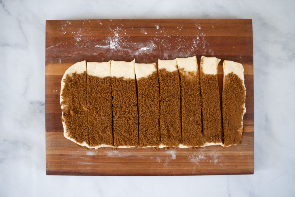3) Starting from the edge of the dough closest to you, cut dough into eight 2″-wide strips. Roll each strip from bottom to top into a tight cylinder, pressing lightly to adhere.