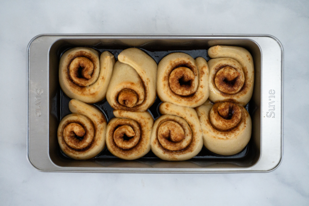 4) Spray a Suvie pan with cooking spray. Place rolls in the prepared pan, sprinkling any excess brown sugar from the cutting board over them. Cover pan with greased aluminum foil and place in the bottom zone of Suvie. → Hold the Tap to Scan tag to the logo on the appliance.
