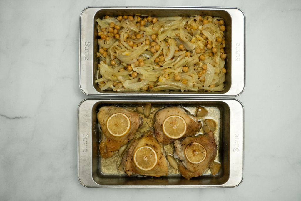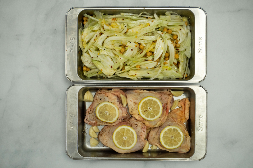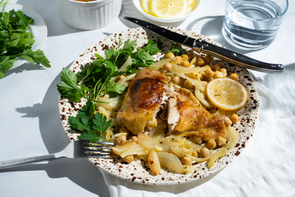 This cozy dish delivers major flavor with only a handful of ingredients. Thinly sliced fennel, chopped lemon, and chickpeas slowly roast alongside rich chicken thighs. The lemon peel adds a welcome bitterness to the silky fennel and a dash of red pepper flakes delivers a little punch of heat. We love dill or parsley with this dish, but use whatever herbs you fancy.
