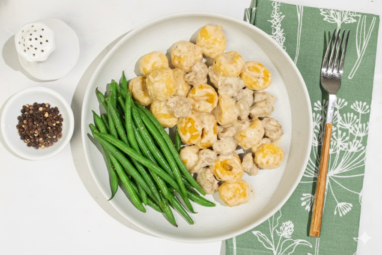 Indulge in cold weather comfort with our latest Italian meal. Pillowy pumpkin gnocchi are roasted in creamy cacio e pepe sauce studded with juicy pieces of Italian sausage. Served with a side of tender green beans, this satisfying meal will keep you cozy throughout the season.