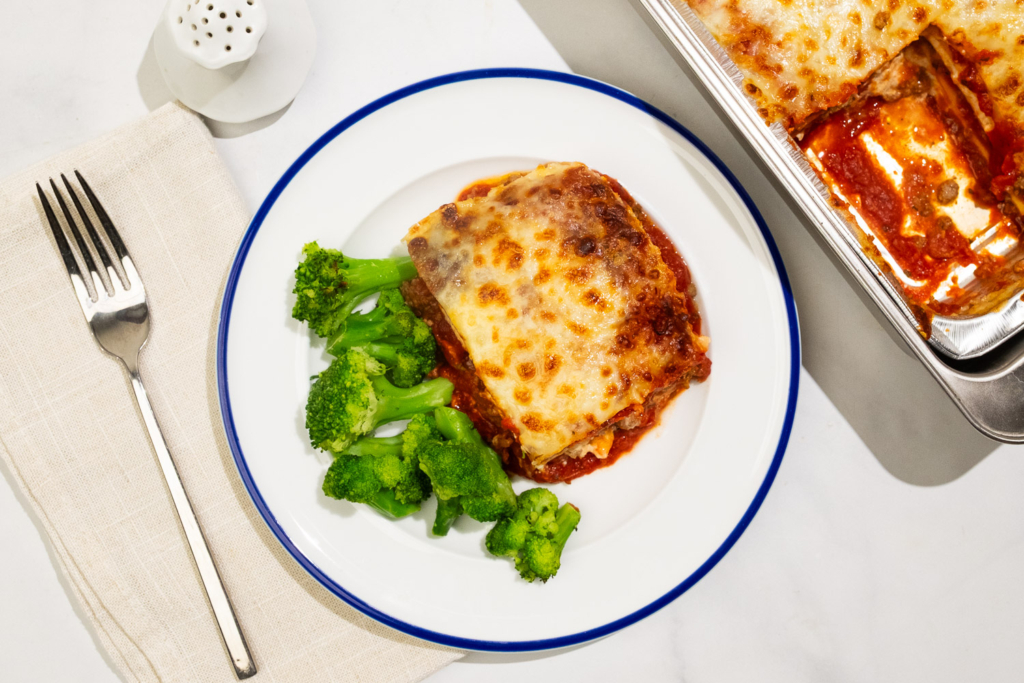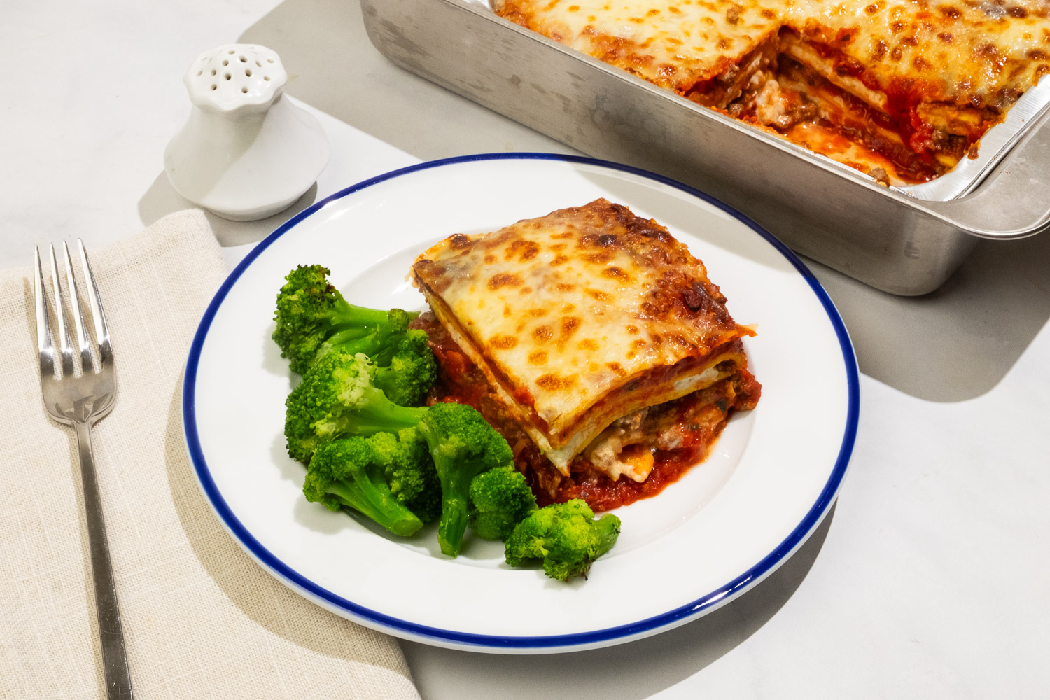 Our hearty beef lasagna is the perfect family-friendly meal. Tender sheets of pasta are layered with creamy ricotta, umami-rich beef, and zippy marinara sauce. A layer of bubbling mozzarella cheese is the crowning glory for this Italian classic. Served with a side of broccoli, this 4-serving meal delivers big, bold flavor.