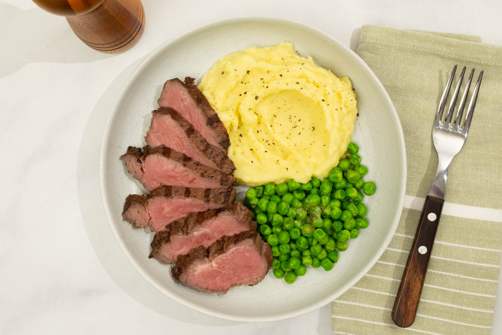 7) Divide potatoes and peas between plates. Cut steak across the grain into slices, divided between plates, and serve.